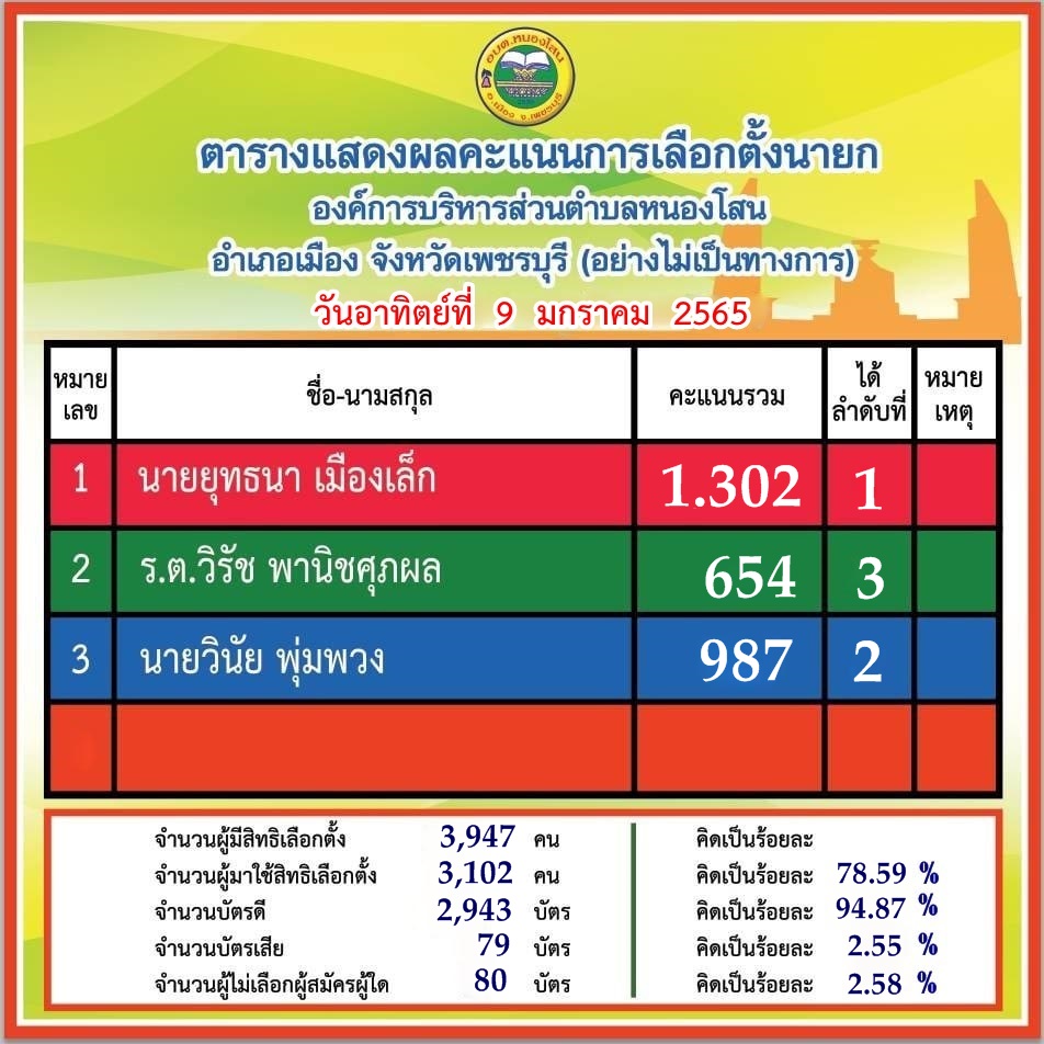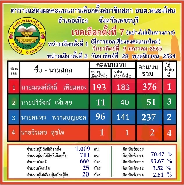 วันที่ 9 ม.ค. 2565 นายนาฎ วงศ์ทองดี ผู้อำนวยการกรรมการการเลือกตั้งประจำองค์การบริหารส่วนตำบลหนองโสน /ปลัดองค์การบริหารส่วนตำบลหนองโสน ปฏิบัติหน้าที่นายกองค์การบริหาร ส่วนตำบลหนองโสน ลงพื้นที่ตรวจเยี่ยมดูความเรียบร้อยในเขตเลือกตั้งที่ 7 หน่วยเลือกตั้งที่ 1 ตำบลหนองโสน เมื่อถึงเวลา 08.00 น. ประธานคณะกรรมการฯ และคณะกรรมการประจำหน่วย เลือกตั้งฯ แจ้งเปิดหีบลงคะแนนเสียงเลือกตั้งใหม่ มีพี่น้องประชาชนตำบลหนองโสน หมู่ที่ 7 ผู้มี สิทธิเลือกตั้ง ตั้งแต่บ้านเลขที่ 1 – บ้านเลขที่ 134 ทยอยออกมาใช้สิทธิกันอย่างต่อเนื่อง เมื่อถึง เวลา 17.00 น. หน่วยเลือกตั้งฯ ได้ปิดหีบและนับคะแนนมีประชาชนร่วมดูการนับคะนนเลือกตั้งฯ กันอย่างคึกคัก ผลคะแนนการออกเสียงลงคะแนนใหม่ของการเลือกตั้งนายกและสมาชิกสภาองค์การบริหารส่วนตำบลหนองโสน เขตเลือกตั้งที่ 7 หน่วยเลือกตั้งที่ 1 อย่างไม่เป็นทางการออกมาดังนี้